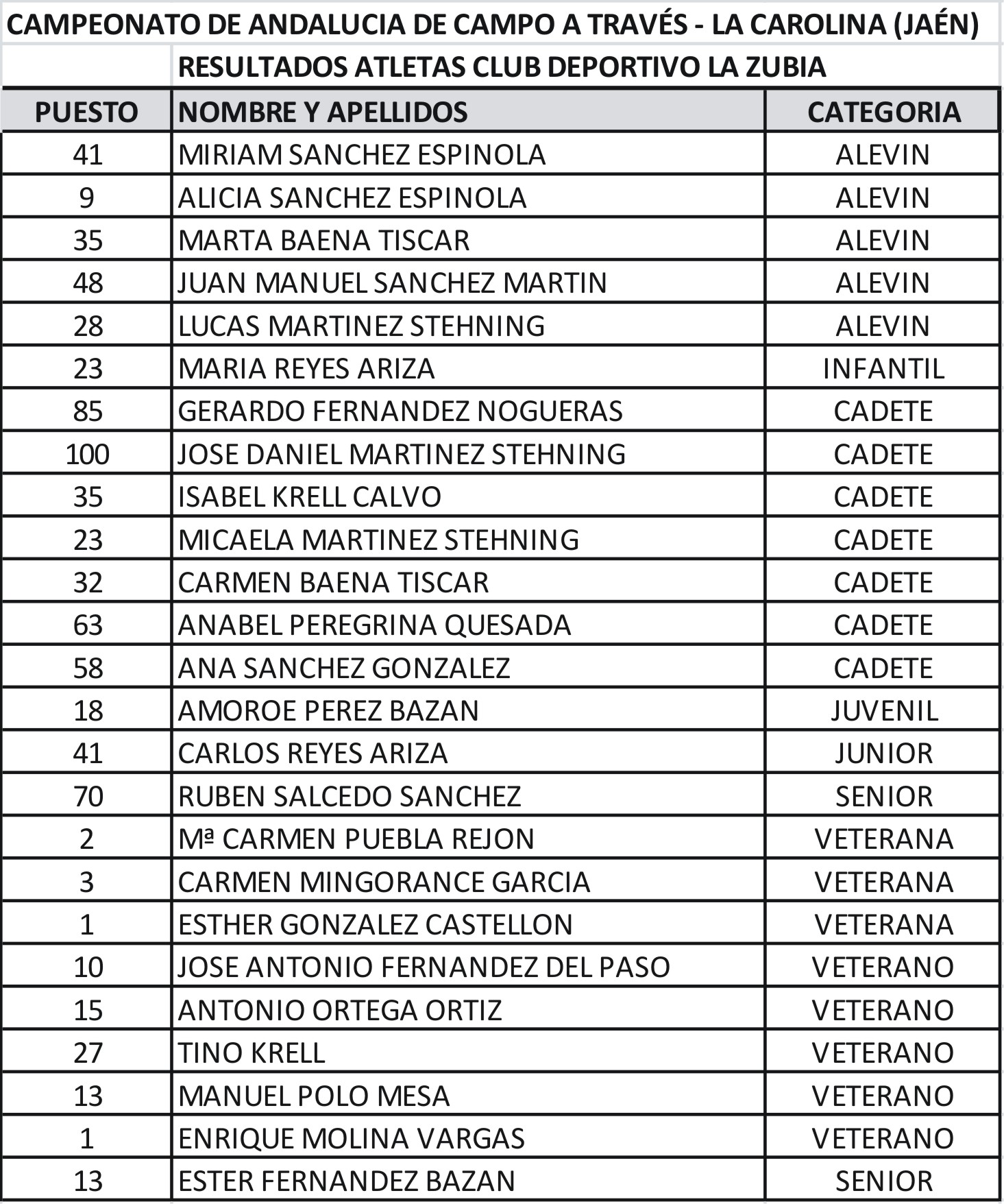 Excelentes los resultados de todos/as los/as atletas del Club Deportivo La Zubia que han participado en el Campeonato de Andalucía de Campo a Través celebrado este domingo día 12 de febrero en La Carolina, Jaen.