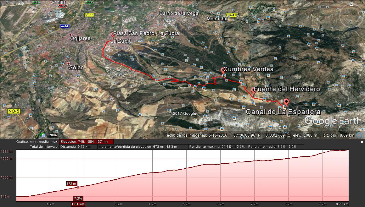 OPCION SALIDA 1, DESDE LA ZUBIA a las 20:30 horas. (Distancia aproximada 10 Km y solo para participantes a partir de 16 años de edad). Salida desde la Plaza San Pedro (La Zubia), Urbanización Laurel de La Reina, Camino Forestal, Pinos del Carretero, Cumbres Verdes, Fuente del Hervidero y llegada al Canal de La Espartera.