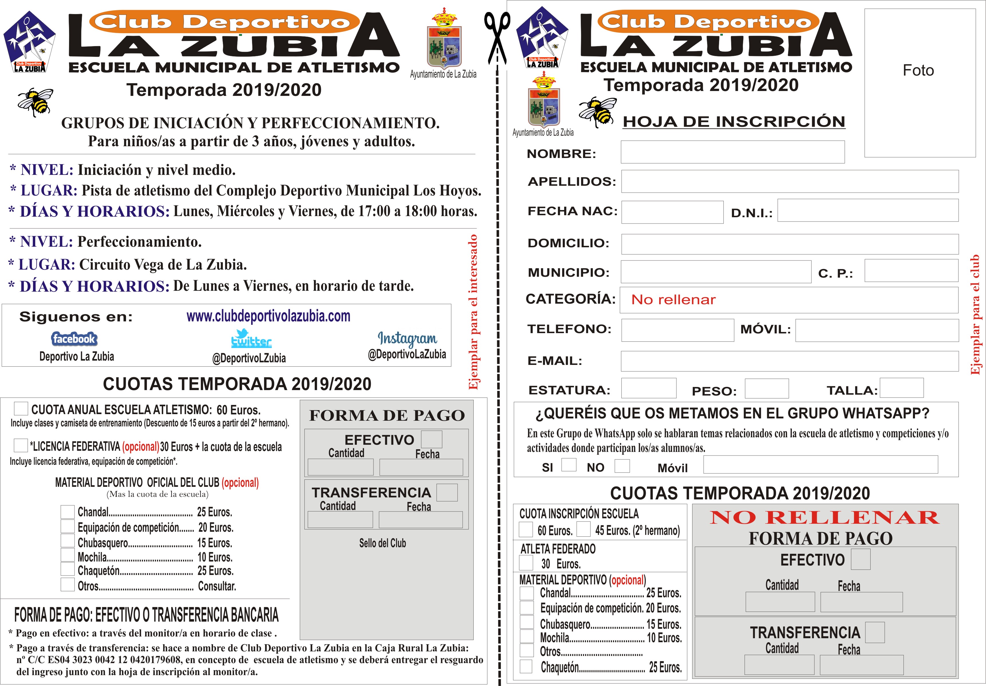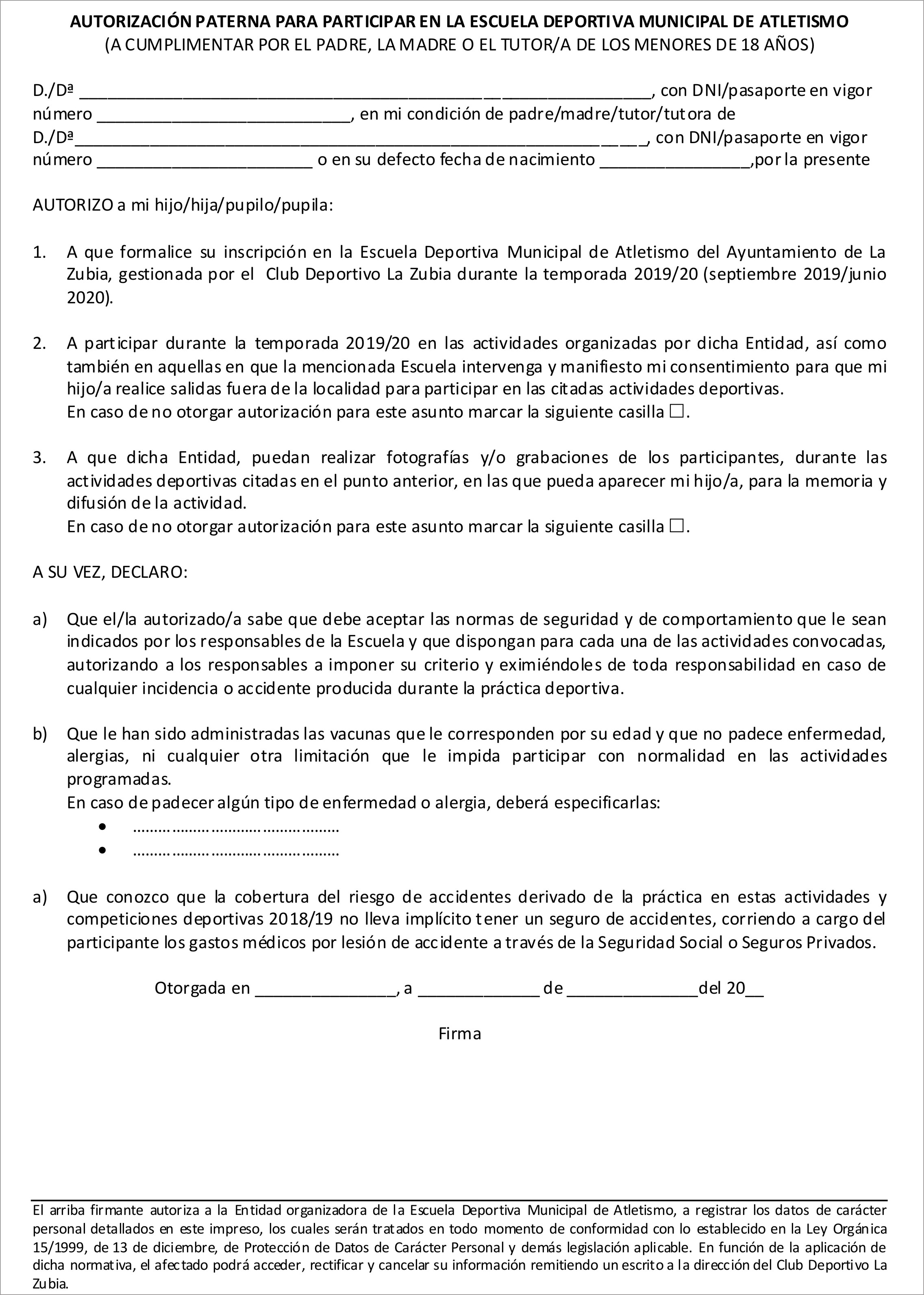 Para la formalización de la inscripción se puede descargar el Impreso inscripcion y la Autorizacion paterna y enviarlos al correo del club deportivolazubia@hotmail.es junto con el justificante de pago bancario y una fotografía de tamaño carnet.