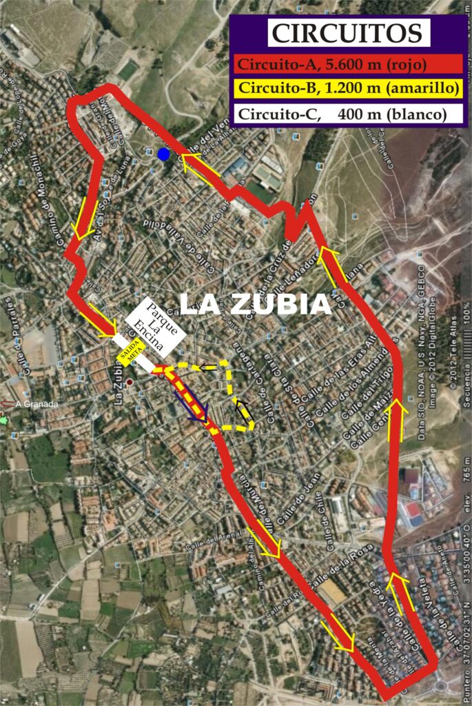 CIRCUITO-A: este circuito es solo para las categorías de Sub-18 a Máster y dará una vuelta al municipio de La Zubia con una distancia aprox. de 5.600 m., pudiendo realizar este recorrido corriendo y/o andando, siendo el tiempo máximo para realizarlo de 1 hora y 30 minutos.